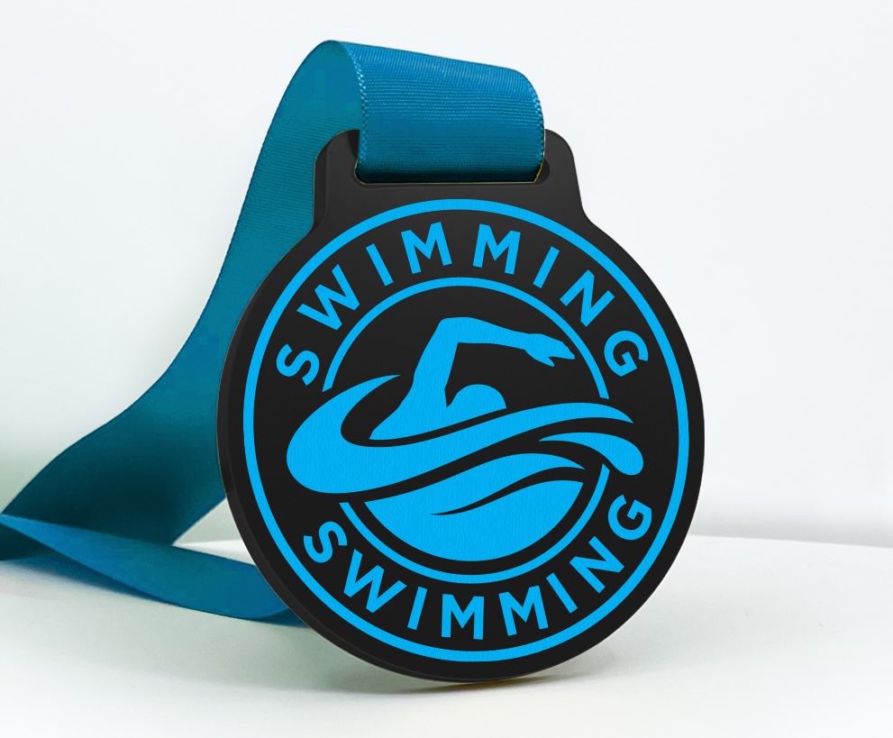 If you want your swimming medal to make a bold, high-energy impression, this design ticks every box. Crafted in durable black acrylic with bright cyan printing, it’s clean, modern, and all about movement.